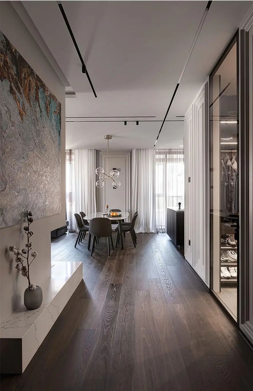 独立衣帽间规划在餐厅附近的过道处,用玻璃门隔断,空间更显通透,收纳区内嵌灯带,营造出精致的生活氛围,也满足一家人对于衣物的收纳需求。