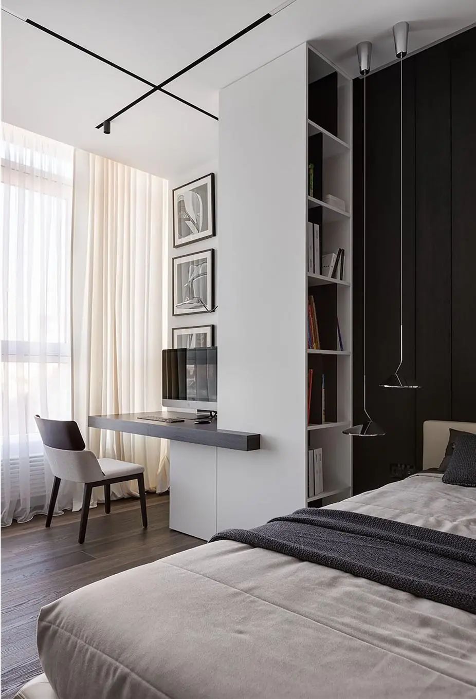 另外一间卧室的布置也丝毫没有马虎,床头规划了大面积的木质护墙,营造出沉静的睡眠氛围,窗边的收纳柜不仅延伸出书桌学习区,还能当作床头柜使用,随手置放书本、手机等杂物都是很合适的。