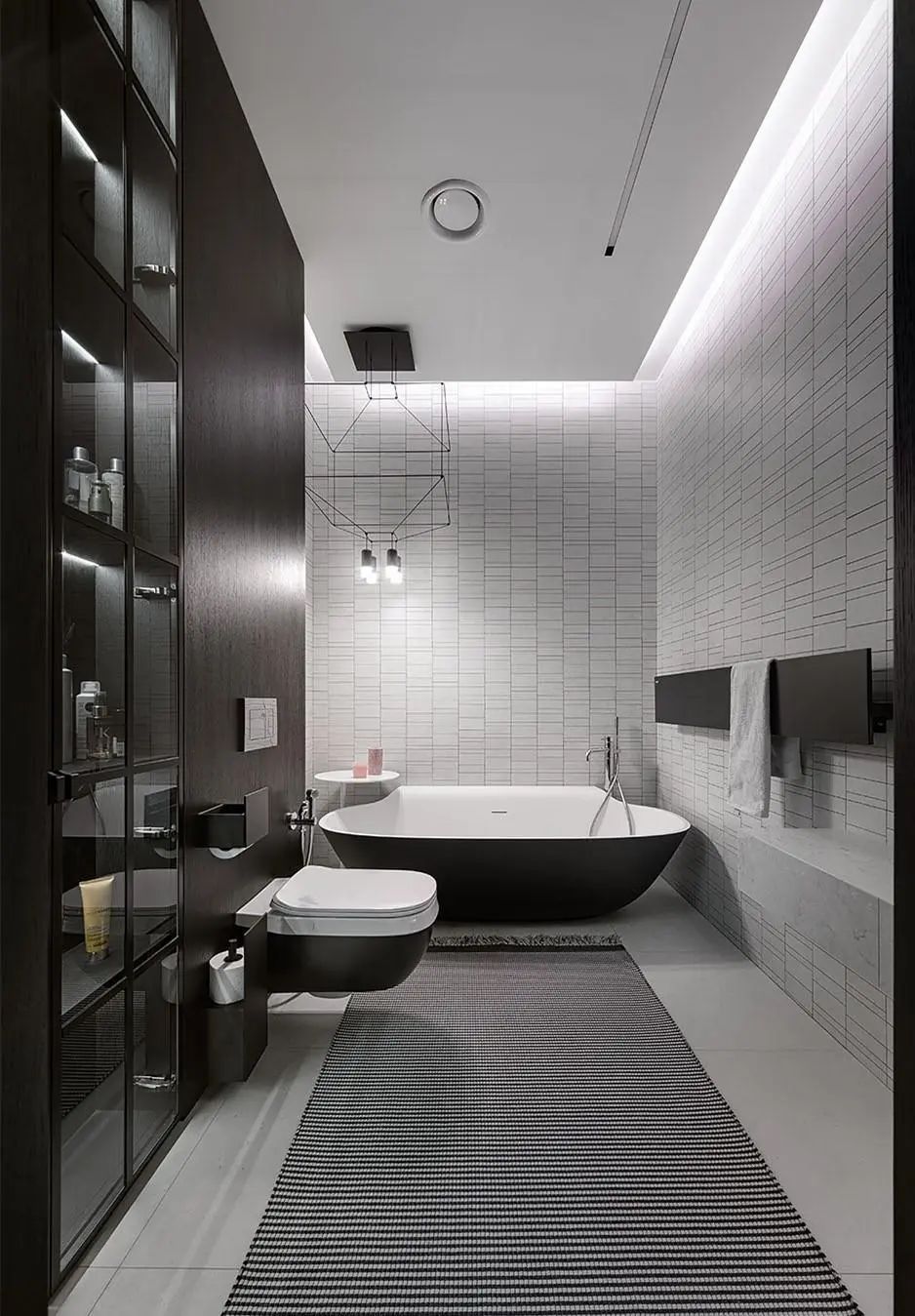 连卫生间的装修都是那么大气,内嵌玻璃柜,用来收纳各种护肤品很不错,内嵌灯带,让生活的仪式感满满。