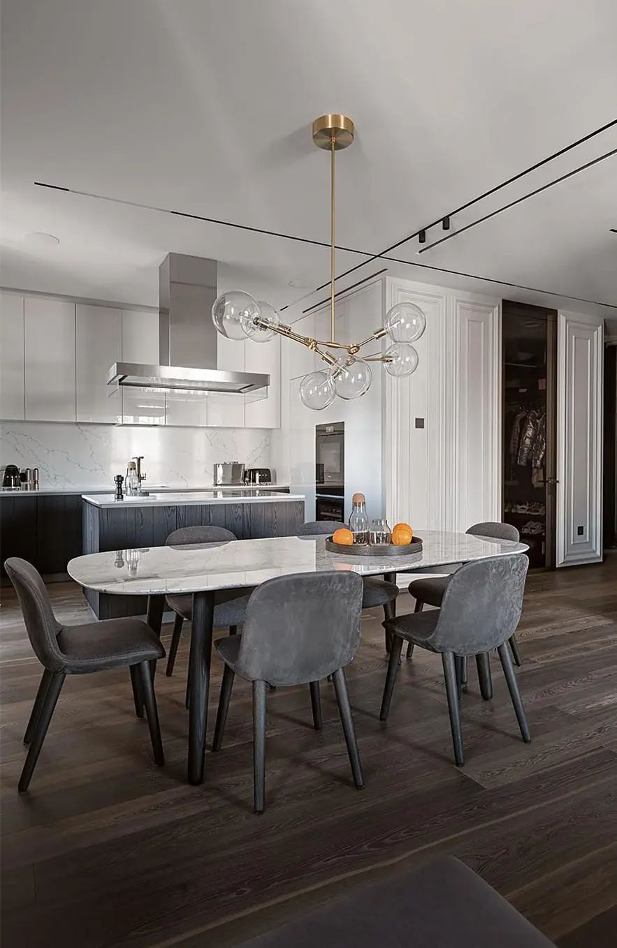 中岛台不仅隔断了烹饪区和餐厅,也增加了操作空间和收纳空间,在此用餐也是个不错的选择,增加了生活的互动性和体验感,整体柜以内嵌式的方式为电器提前预留位置,让空间整体感更好。