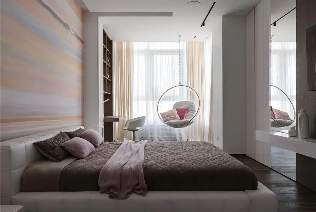 床尾一面墙安装了电视,内嵌式的开放式置物区,搭配简单的薄抽屉,满足一些小物件的收纳需求,提高了空间利用。