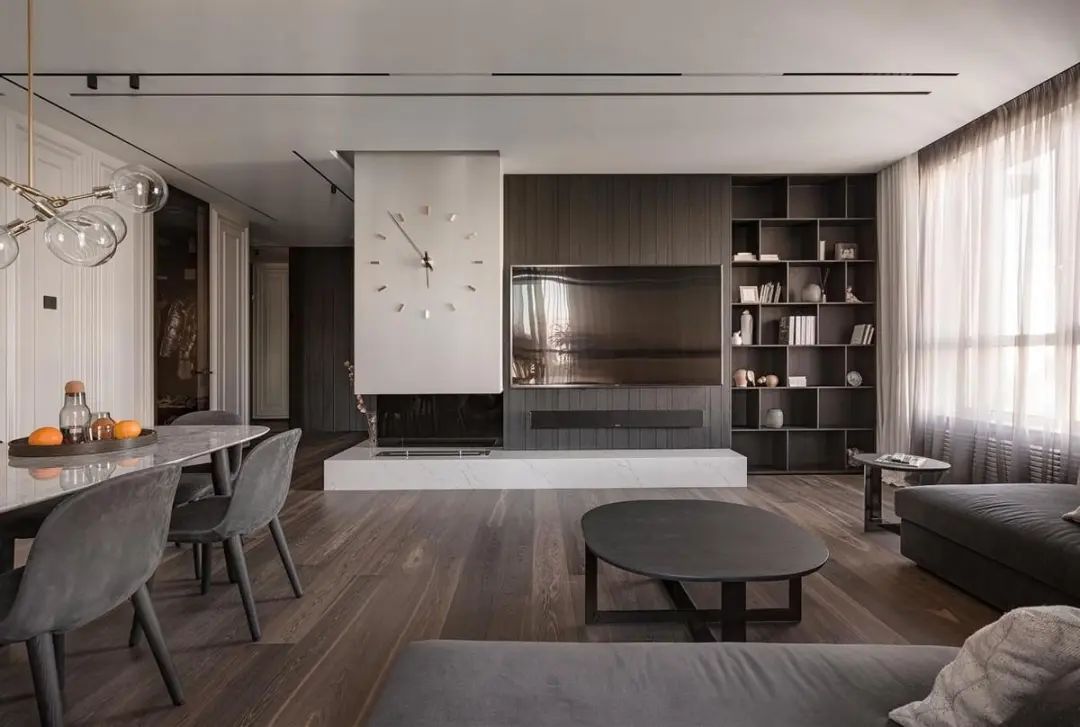 电视背景墙 一 大面积木质元素为主,规划了一面开放式书架,满足屋主对于书本的收纳需求,底部增设石台,丰富空间层次感,营造出高级的空间氛围。