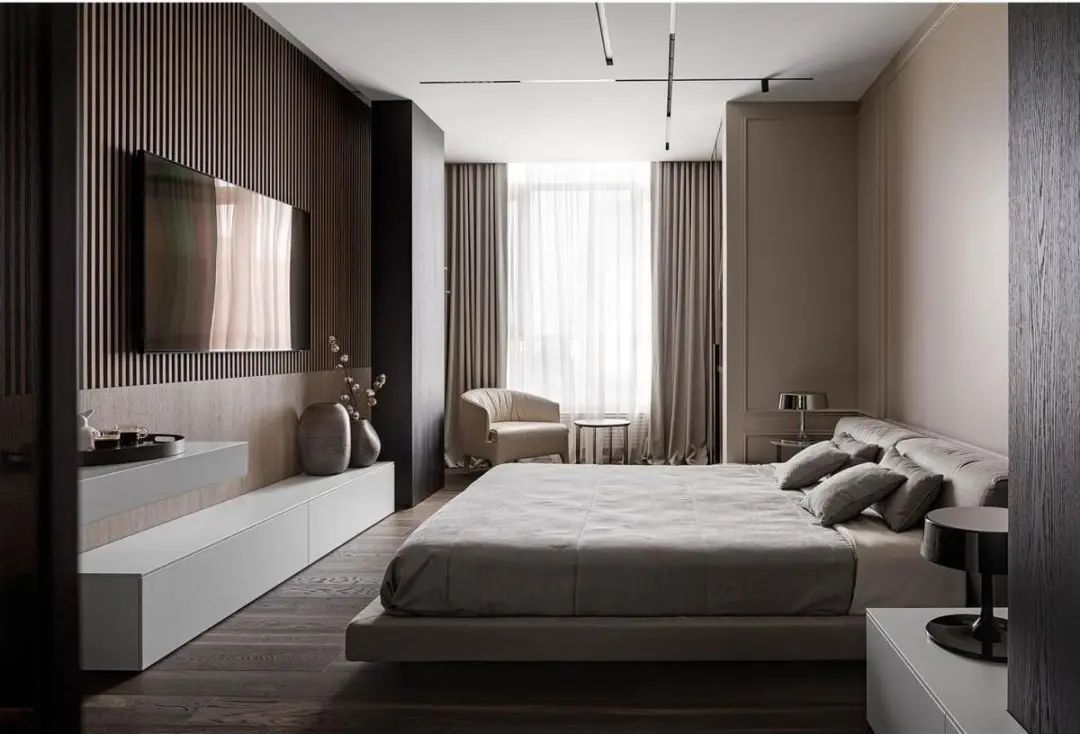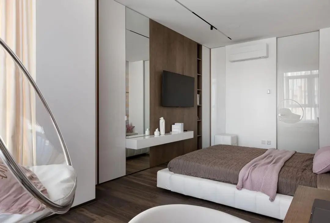 根据屋主的生活习惯,主卧床尾规划了一排电视柜,可以置放花瓶等展品,也可以收纳一些杂物,梳妆区也规划在床尾处,简单的薄抽屉满足基本的生活需求。